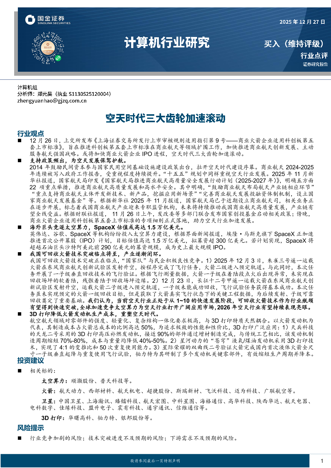 计算机行业研究:空天时代三大齿轮加速滚动