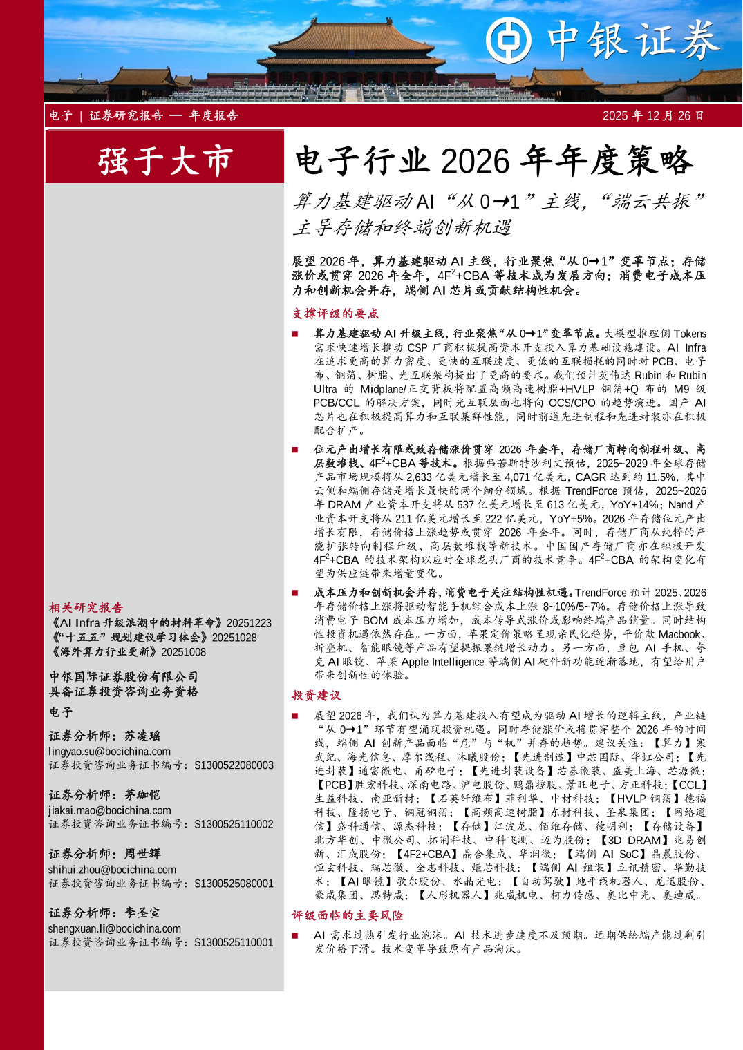 电子行业2026年年度策略:算力基建驱动AI“从0→1”主线,“端云共振”主导存储和终端创新机遇
