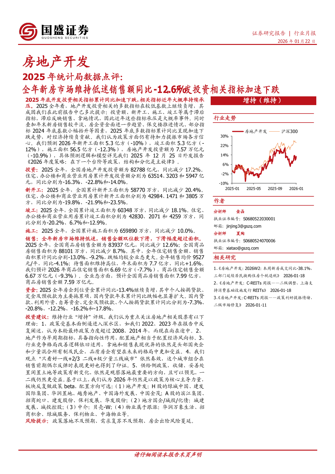 房地产开发行业2025年统计局数据点评:全年新房市场维持低迷销售额同比-12.6%,开发投资相关指标加速下跌