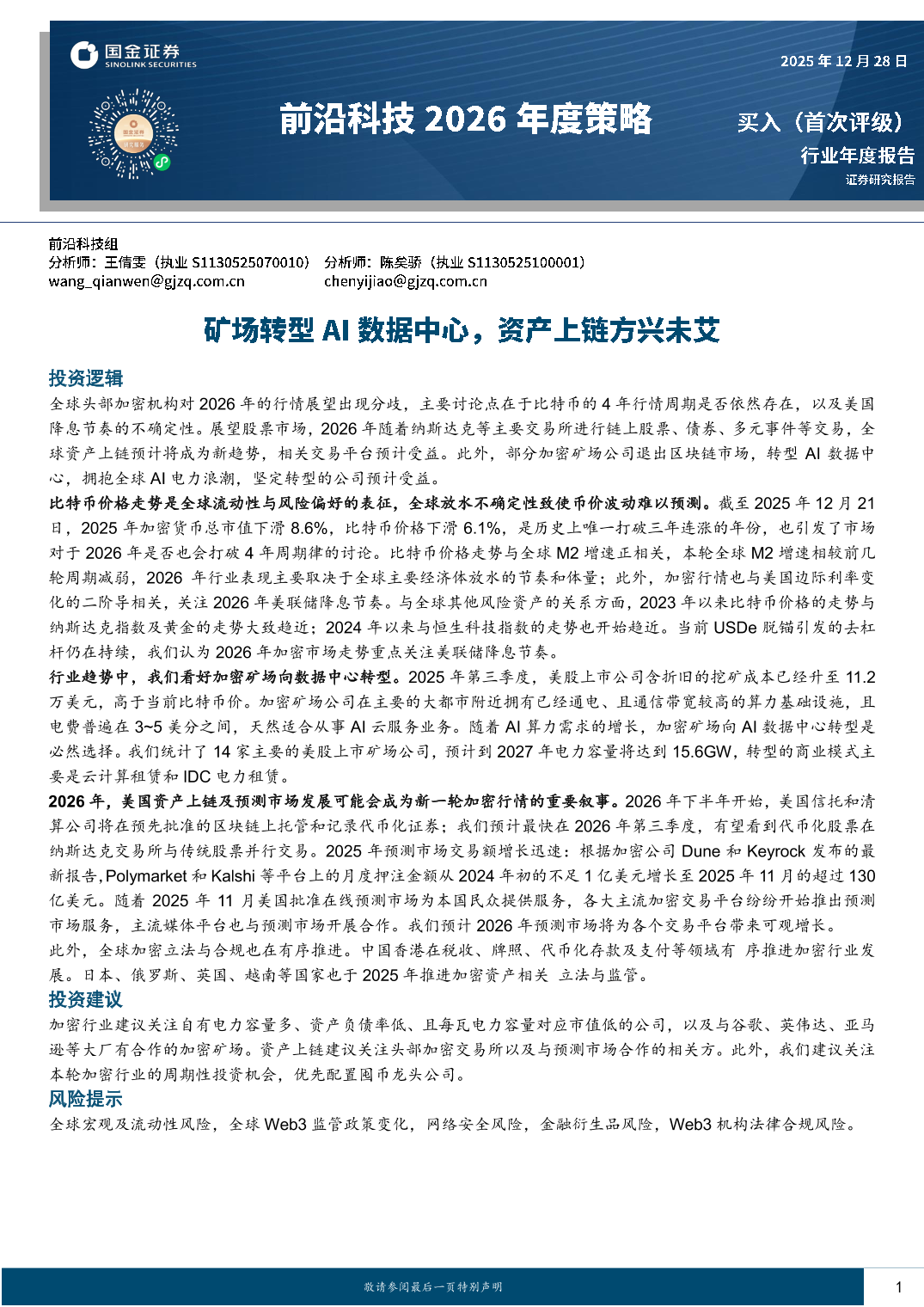 前沿科技2026年度策略:矿场转型AI数据中心,资产上链方兴未艾