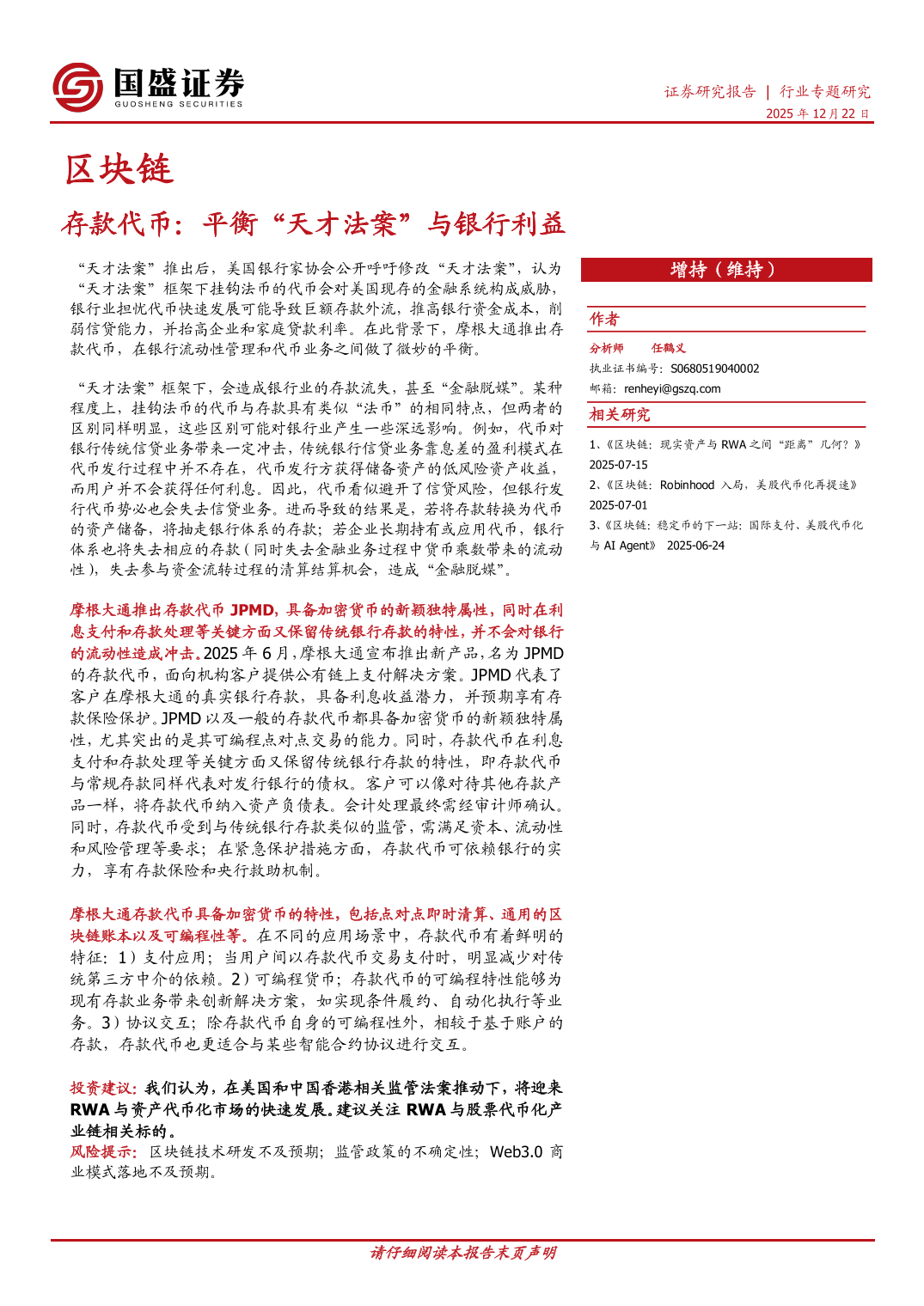 区块链行业存款代币:平衡“天才法案”与银行利益