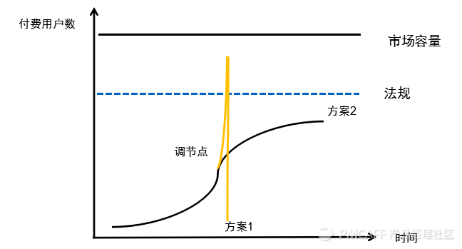 另一种方案时是在调节点,及时的通过一些动作,使增长放缓,始终保持在法规线外,做到闷生发大财。