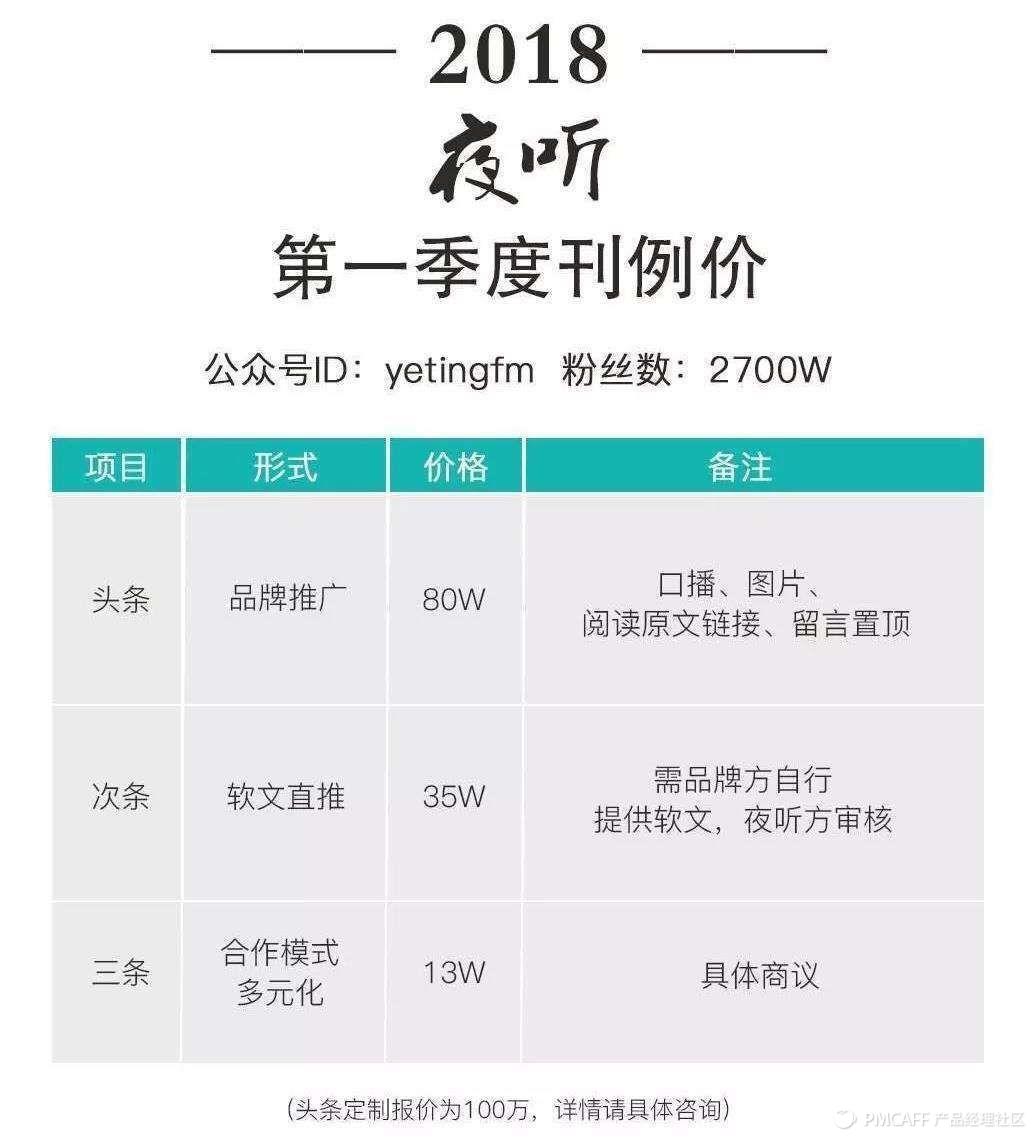 从资本层面上来说,单一的广告形式,尤其是自媒体,存在明显的天花板。之前有个投资人给过一个很有意思的观点,目前订阅号自媒体还没有出现过超过3000万的。已知最大的订阅号夜听的头条报价是80万。但是单靠广告收入营收想要破亿还是很困难。