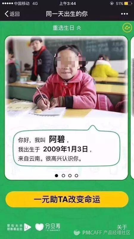 1)情怀公益类:腾讯公益买画,轻松筹,视觉志的《谢谢你爱我》这种朋友圈传递正能量的文章或活动。但也要注意品牌背书,比如同一天生日的公益被封了。这里面有一个非常重要的点,用户一定是自愿的,没有胁迫。