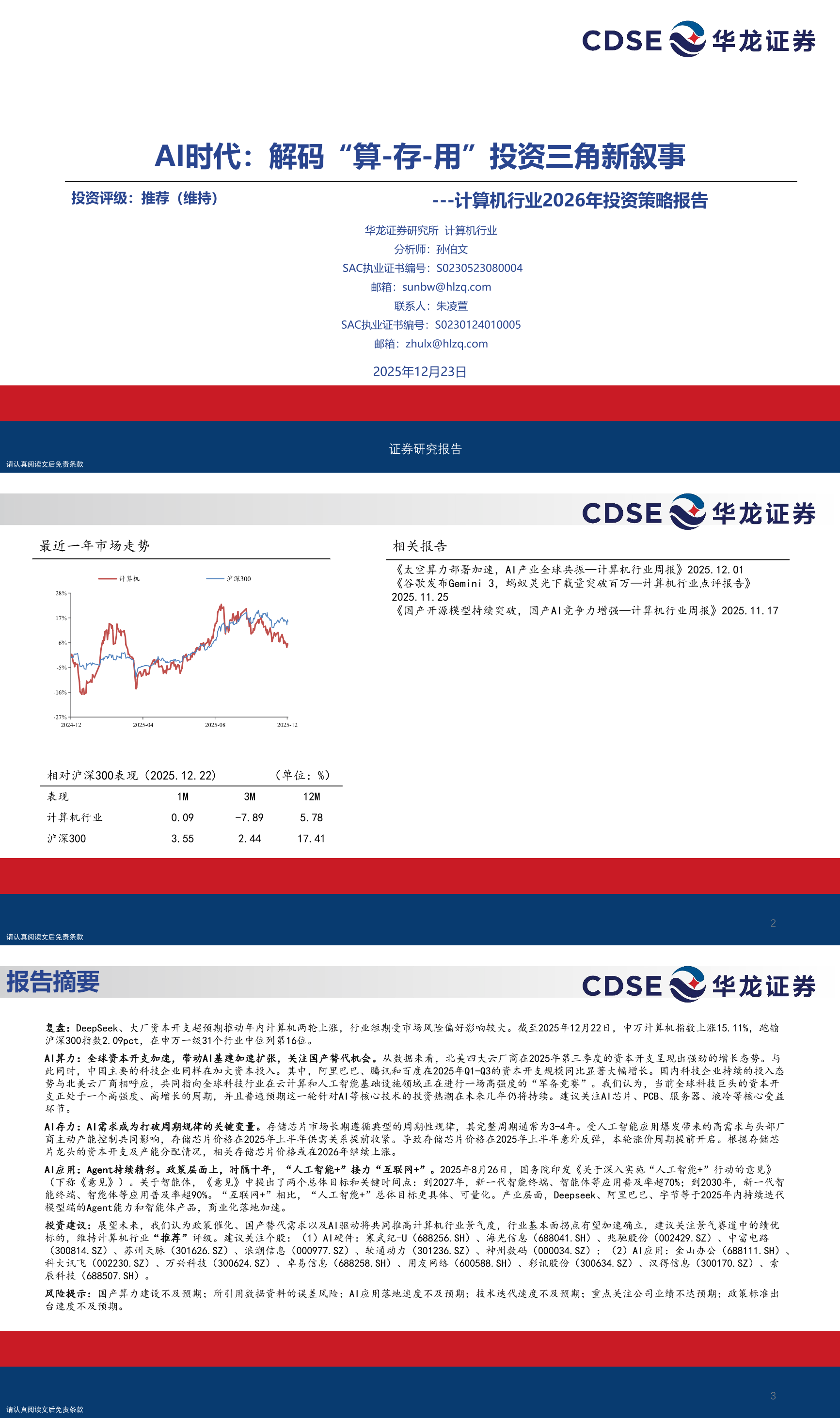 计算机行业2026年投资策略报告:AI时代:解码“算-存-用”投资三角新叙事